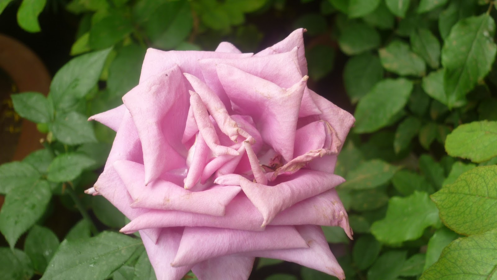 தண்ணீர் கேட்டு இலைமேல் சாய்ந்து வாடிக்கொண்டிருக்கும் ஒரு வெளிர் ரோஜர்.