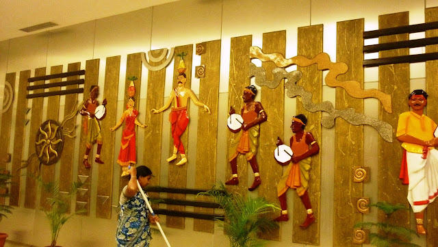 ராமர் , ஆஞ்சநேயர், ராவணன் என நினைக்கிறேன். யக்ஷகானம் போல ஏதோ கூத்துக் கலையின் உடையம்சம் எனத் தோன்றுகிறது. சாதாரண நாளிலே இந்த கண்ணாடிக் கதவுகளில் ஓவியங்கள் அழகூட்டும் ( பாத்ரூம் பக்கம் ) .